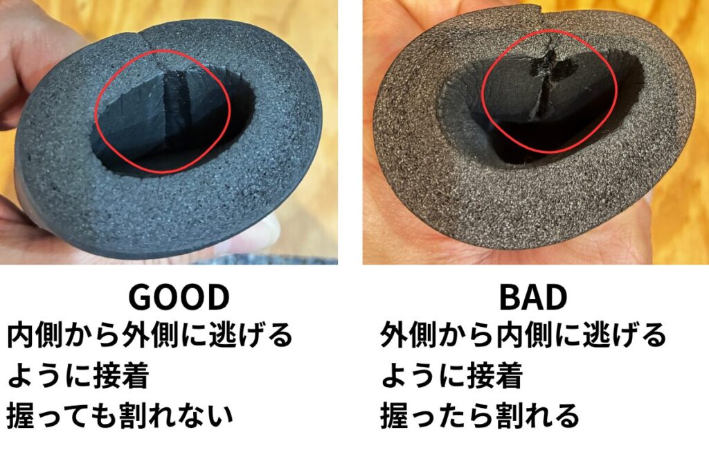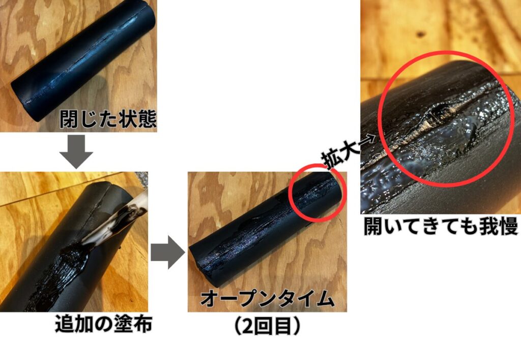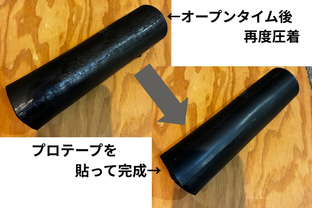 接着後に内側を確認するのは不可能ですが、接着手順をいい加減にすると上の写真の様に表面だけがくっついて、下側(パイプ側)がくっついていない状態になってしまいます。
