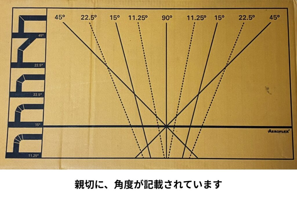 ちなみに、エアロフレックスの筒が入っている箱にはこの様に、角度が記されており、この角度を参考に曲げを自由に作ることが出来ます。また、筒を切ってしまうのではなく浅く切ってエルボーを作ることで、外向きのRがいい感じ仕上がります。