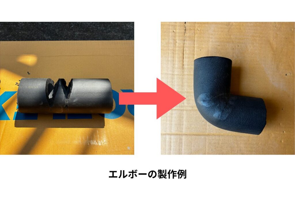 グラスウールの保温筒と違って、エアロフレックスは厚みがあるので保温筒の様に45度でカットしてエルボーを処理することに不向きです。
