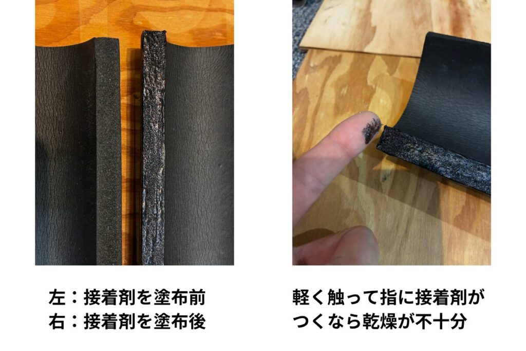 塗ってすぐ貼るのはNGです。接着剤が乾く前に合わせると、溶剤が揮発しきらず接着力が弱くなります。逆に乾かしすぎても粘着力が落ちます。